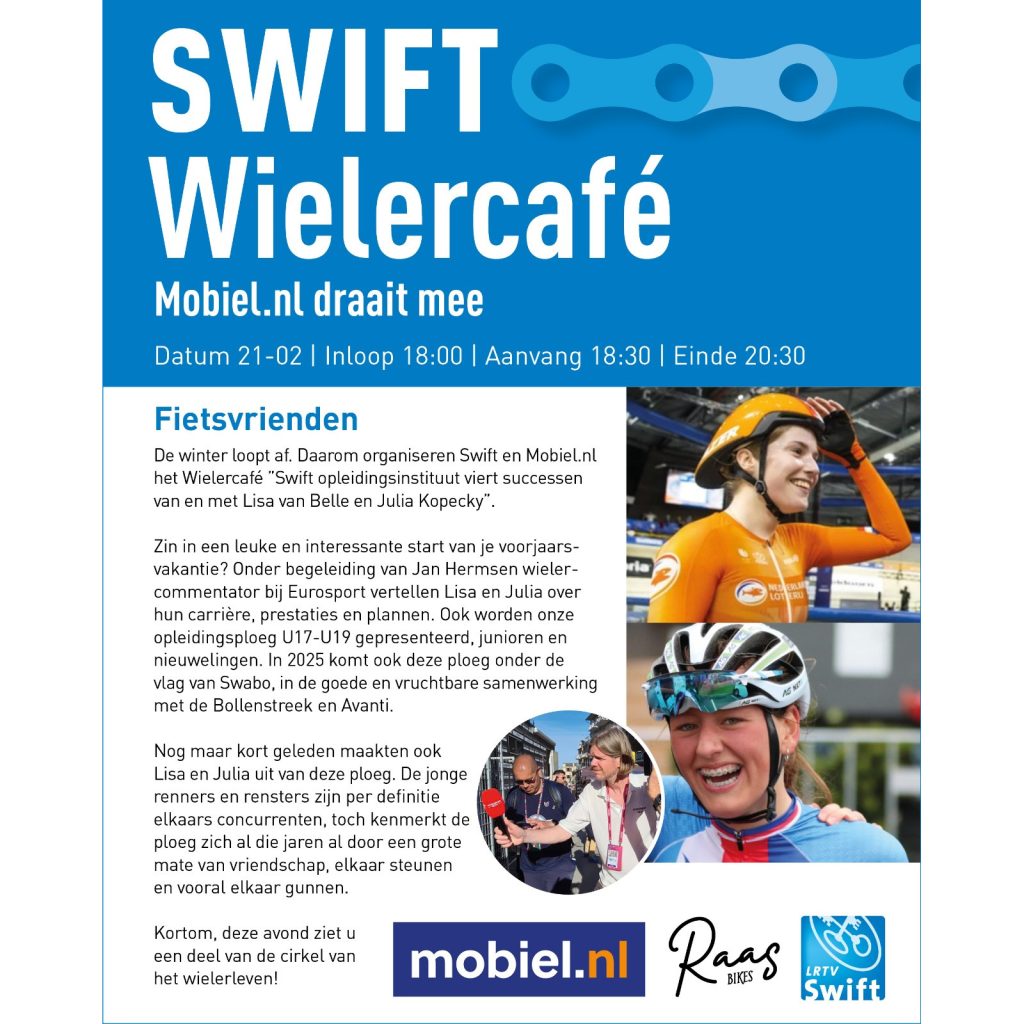 Wij presenteren daar met trots het SwABo U17/U19 Cyclingteam. Het nieuwe combinatie team van LRTV Swift, WV Avanti en RTV De Bollenstreek. We nodigen je dan ook graag uit om hierbij aanwezig te zijn.